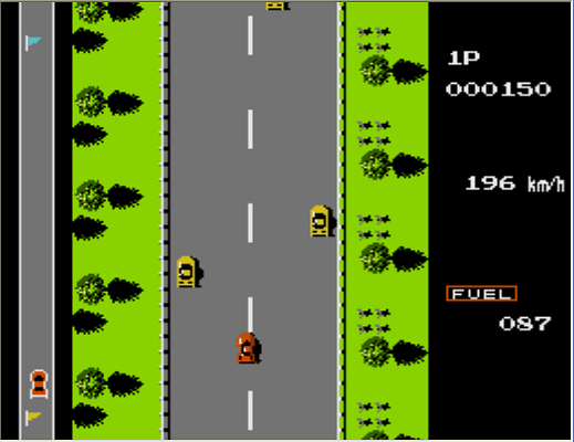 İlk kırmızı arabamız Road Fighter hız limitlerini dümdüz yollarda aşabildiğimiz ama sonucu hep kaza ile biten bir oyundu. Şimdiki trafik canavarlarının çok oynadığını düşünüyorum.