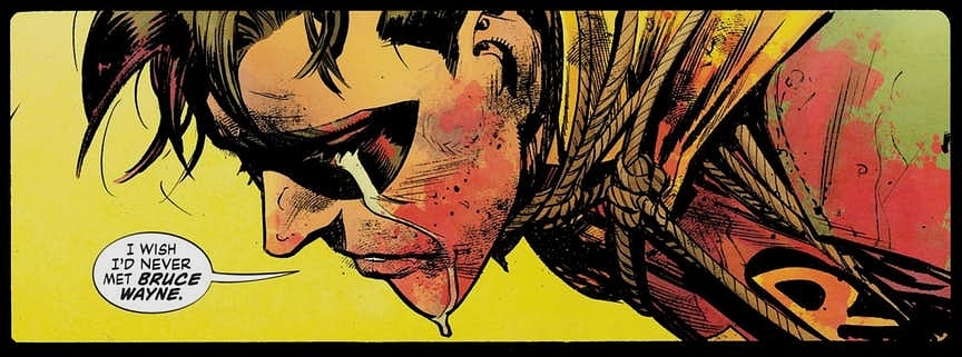 Batman esasen başka hiçbir yere gitmeden çocuğu “bir çocuk askere” dönüştürdü. Bu örnekte, Jason, Bruce Wayne’den ve onu ölüm anına götüren her şeyden nefret ederdi. Artık umursamıyor ve Batman’in savaşlarıyla savaşıyor. Bu Robin’in bir kahraman gibi kavga etmesinin alışılmış hikayesi değil. Bu çocuk küstü !