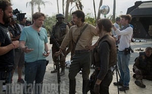 Director Gareth Edwards on set with actors Diego Luna (Cassian Andor) and Felicity Jones (Jyn Erso) on the set