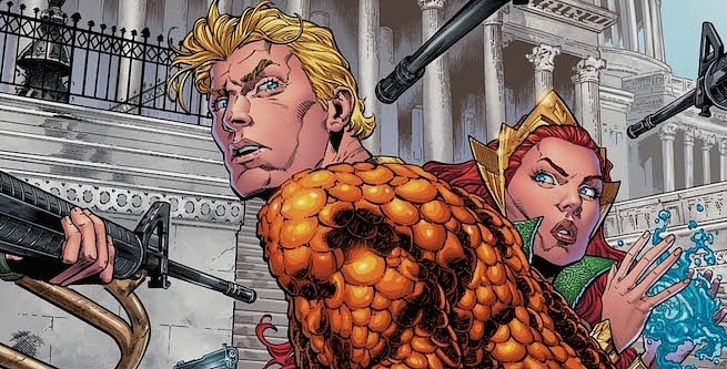 Tipik bir örnek olarak: Günümüz Aquaman’i. Baş kahraman, Başkan’la birlikte Amerikan Donanma Gemisi’ni ziyareti sırasında, bir grup Atlantisli terörist gemidekileri öldürdüğü için, Amerika Başkanı’nın emriyle önce göz altında tutulup daha sonra da Amerika Yurttaşlık Yasası hükümlerine göre tutuklandı.