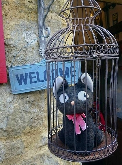 Sadece cadının ismi ve süpürgesi dikkat çekmiyor, Kiki’nin siyah kedisi Jiji de misafirleri selamlıyor.