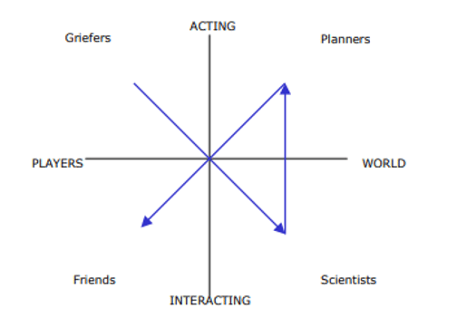 Geleneksel oyuncu modelini bu grafik üzerinden inceleyebiliriz. Oyuncu tiplerine bu grafik üzerinden baktığımız zaman oyuncular Killers, Achievers, Socialisers ve Explorers olarak dörde ayrılmış durumdadır. Bunları açıklamak gerekirse: